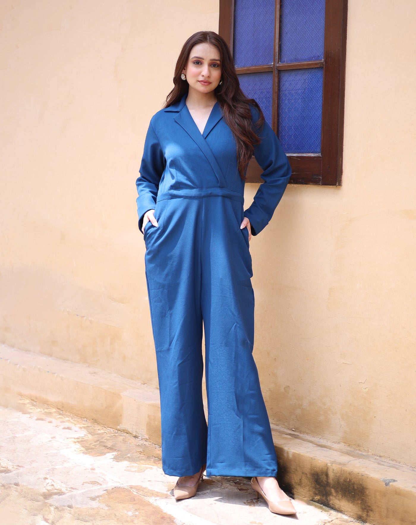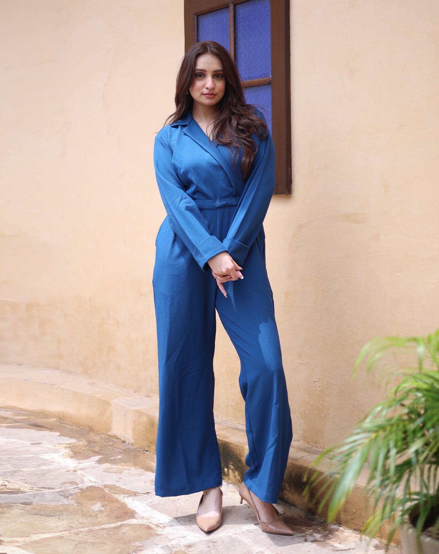 Contemporary poise in a single silhouette. Ziaana is a cobalt-blue, long-sleeve jumpsuit with a wrap-like bodice and tapered trousers. The clean, monochrome surface puts focus on silhouette and drape - perfect for semi-formal evenings and gallery openings.