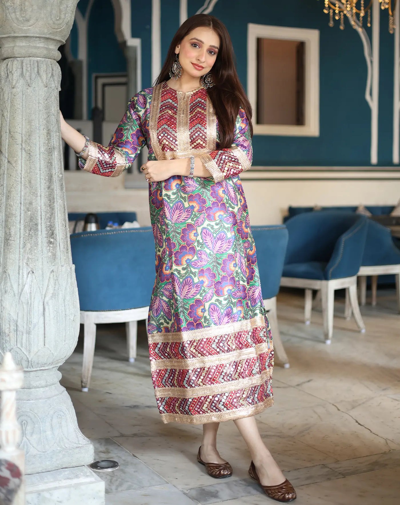 Mirrorwork and golden embroidery along the neckline and cuffs infuse a touch of traditional
