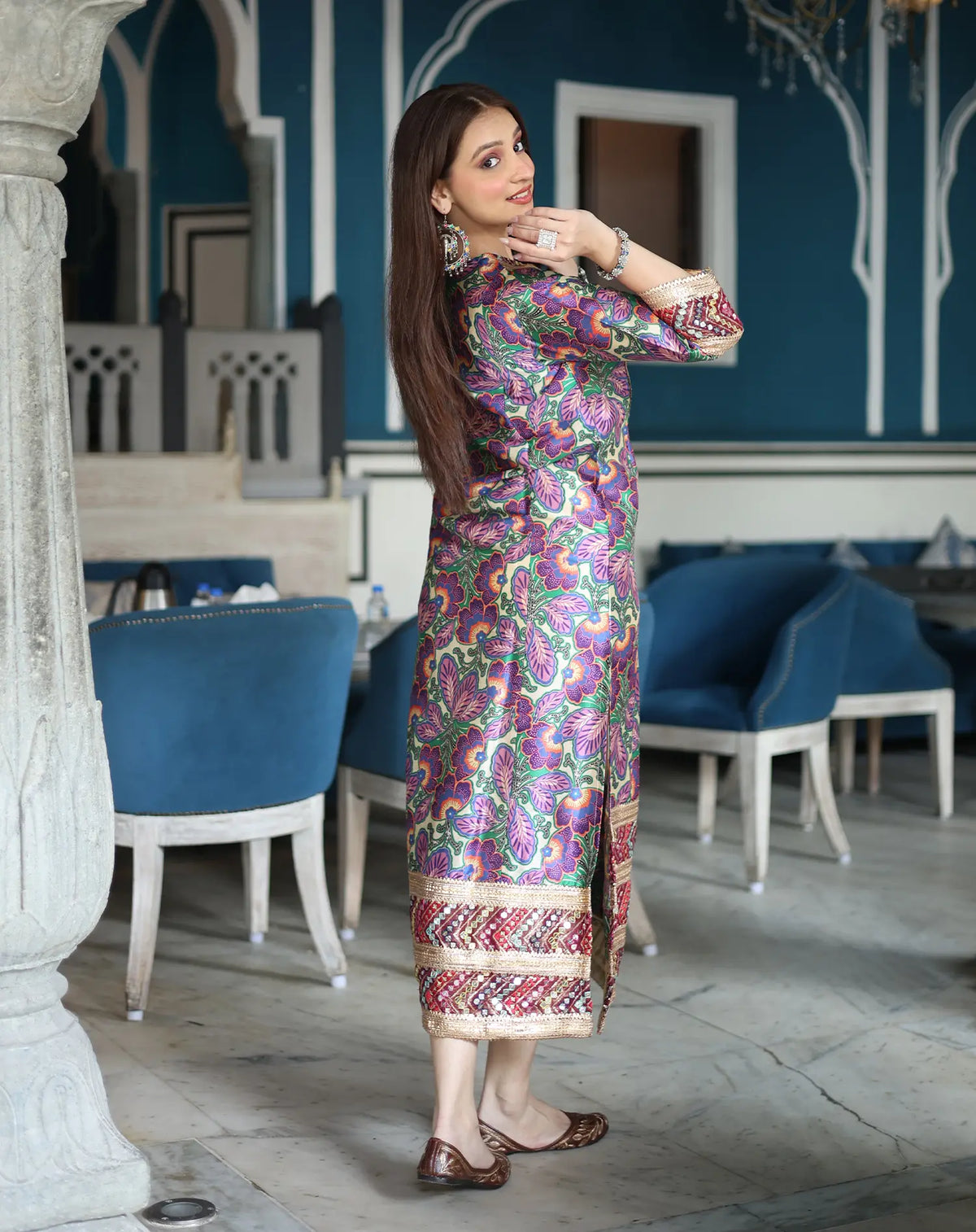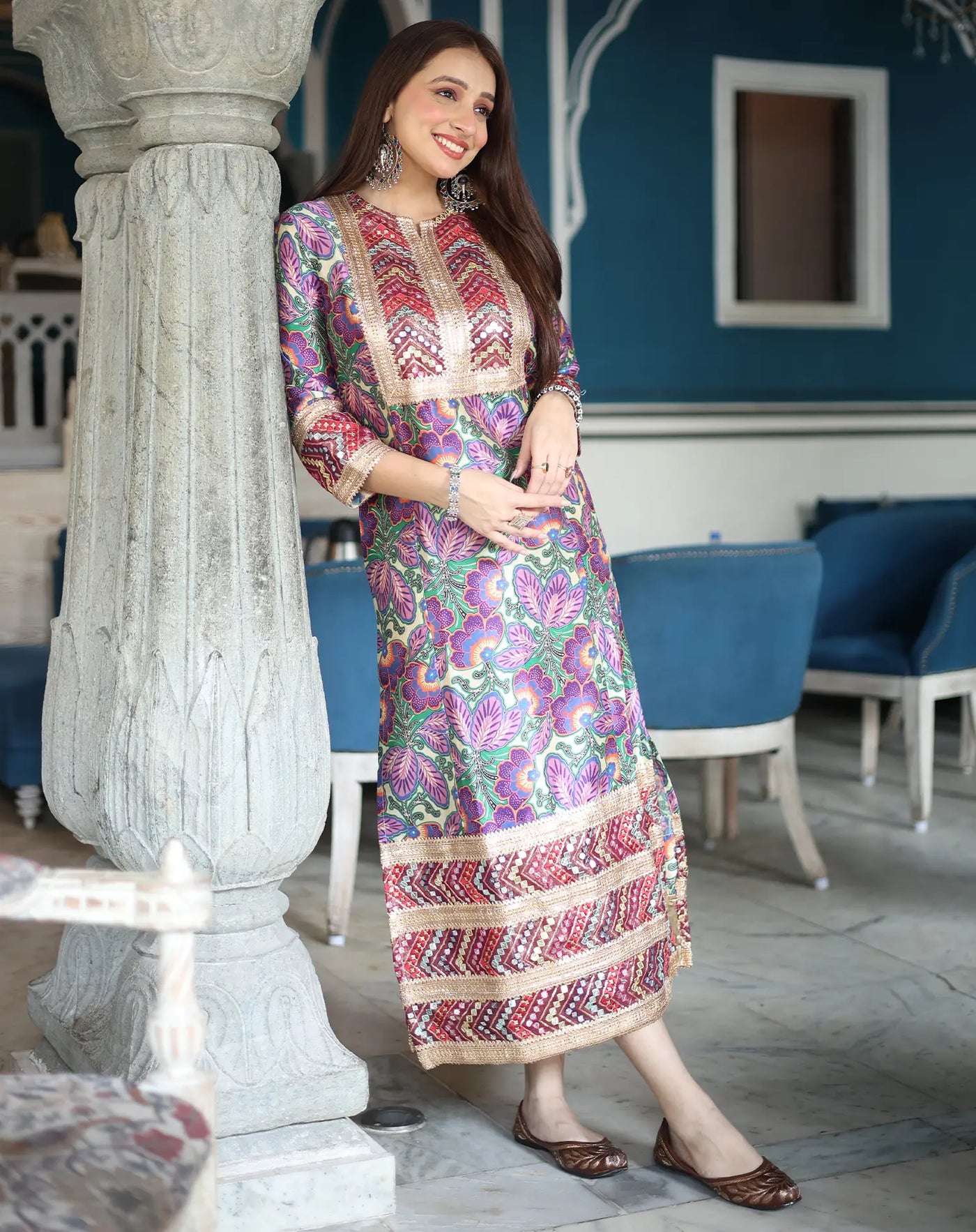 bold floral motifs in purples and pinks over a fresh green base, this kurta radiates charm.