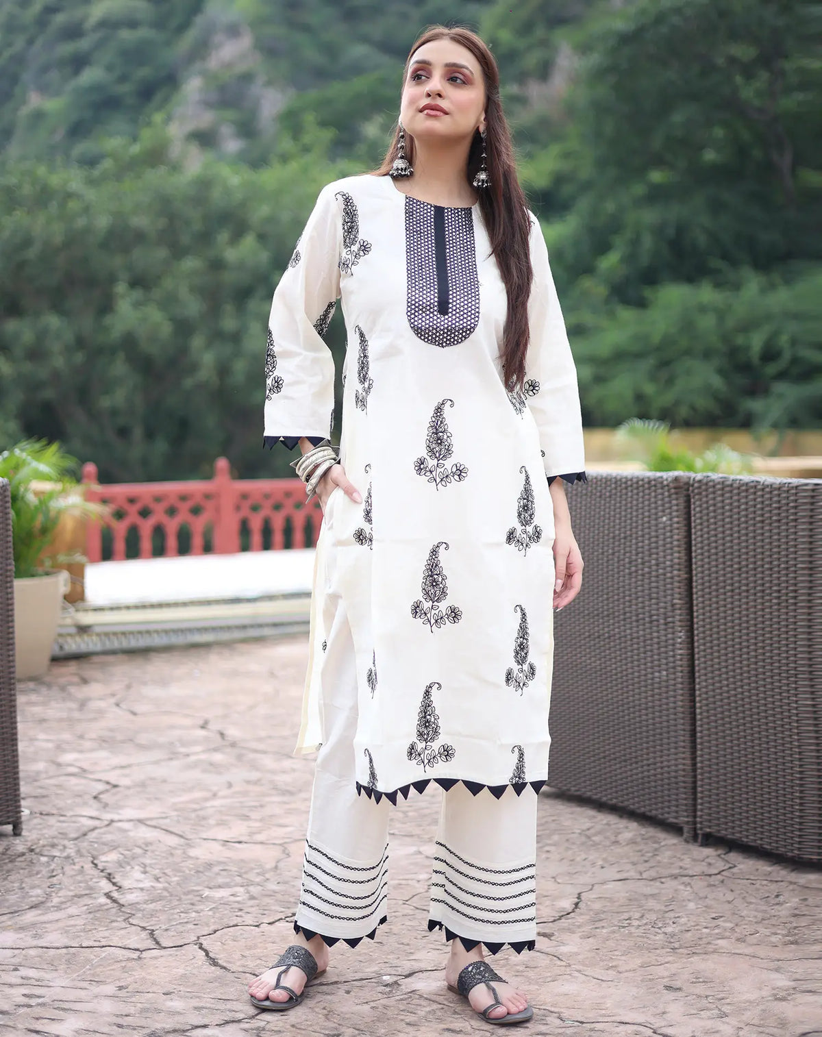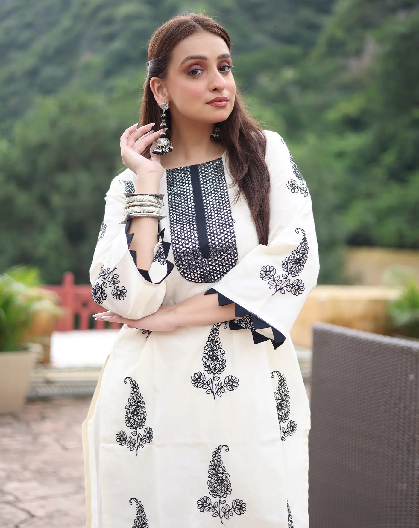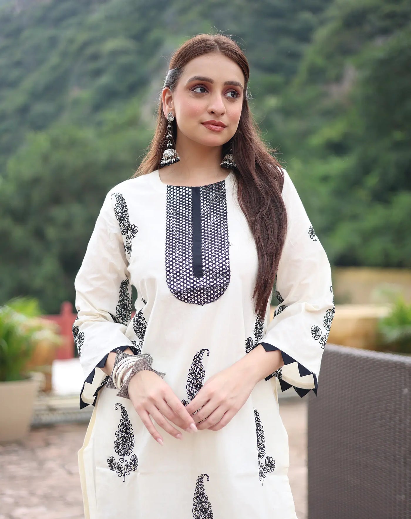 An ode to quiet grace, Desert Mirage embodies purity touched by depth. The soft ivory base is adorned with hand-blocked indigo motifs reminiscent of rivers meeting the monsoon sky. Thoughtfully tailored with a striped hem and gentle detailing, it brings harmony between simplicity and craft. Perfect for languid afternoons and cultural gatherings.