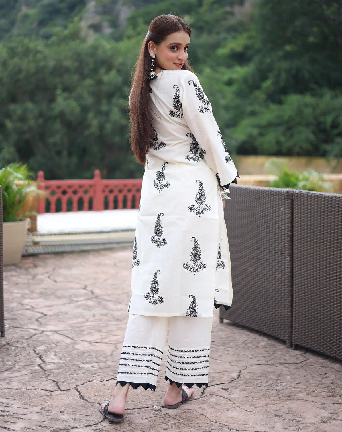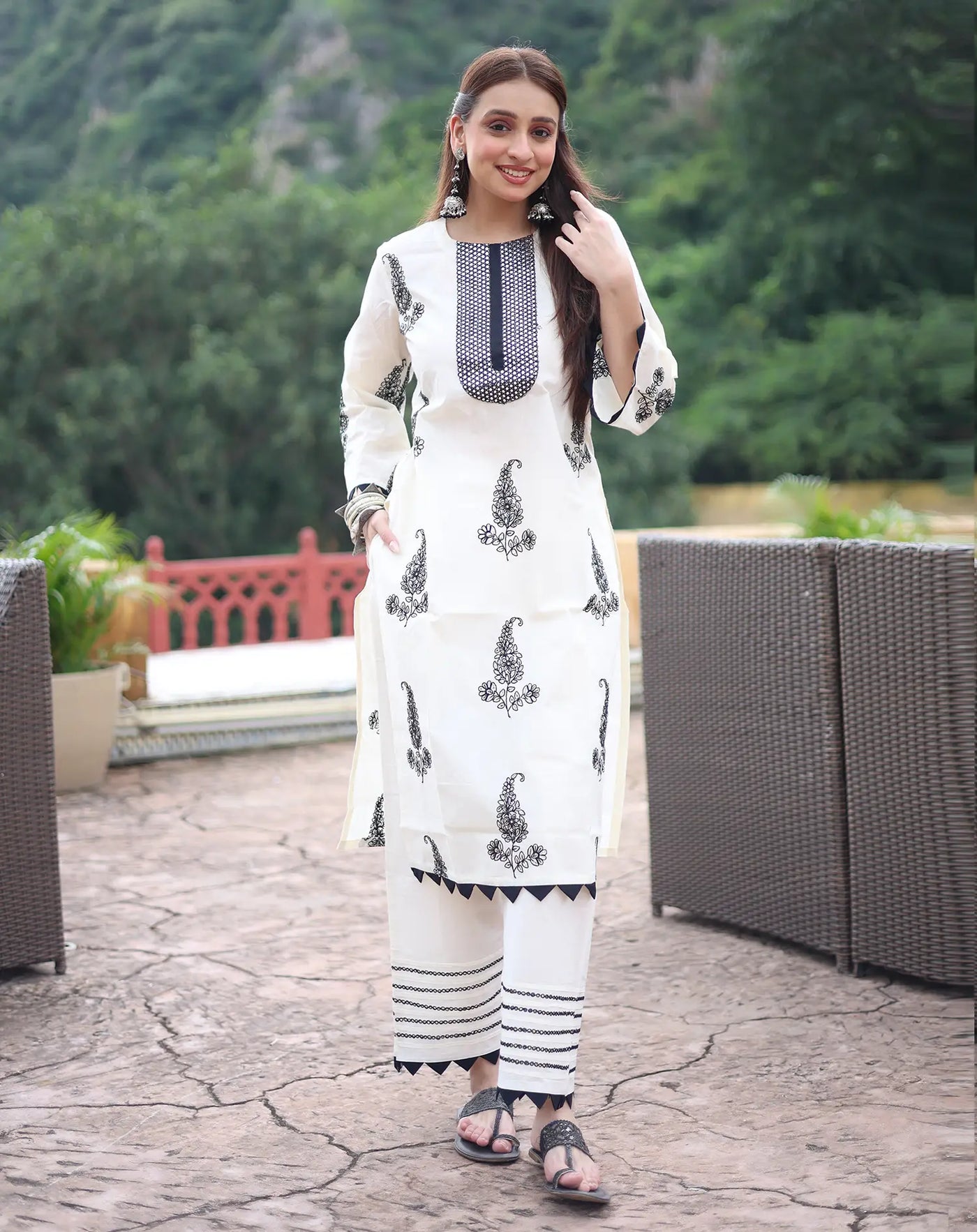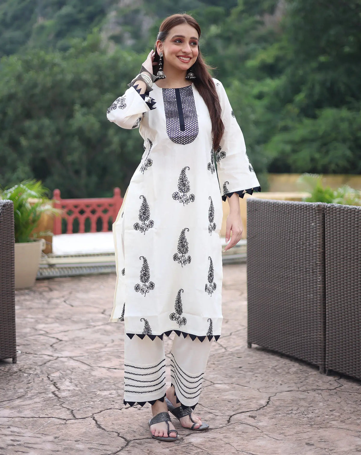 An ode to quiet grace, Desert Mirage embodies purity touched by depth. The soft ivory base is adorned with hand-blocked indigo motifs reminiscent of rivers meeting the monsoon sky. Thoughtfully tailored with a striped hem and gentle detailing, it brings harmony between simplicity and craft. Perfect for languid afternoons and cultural gatherings.