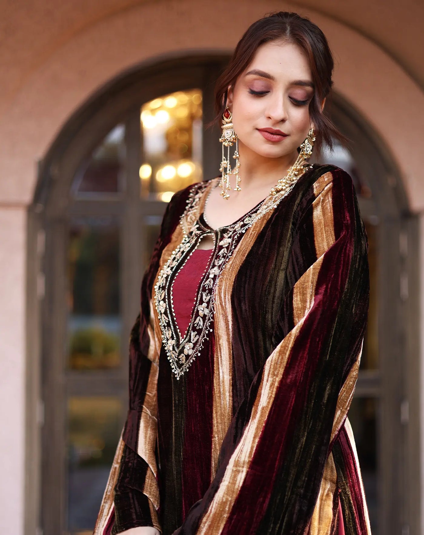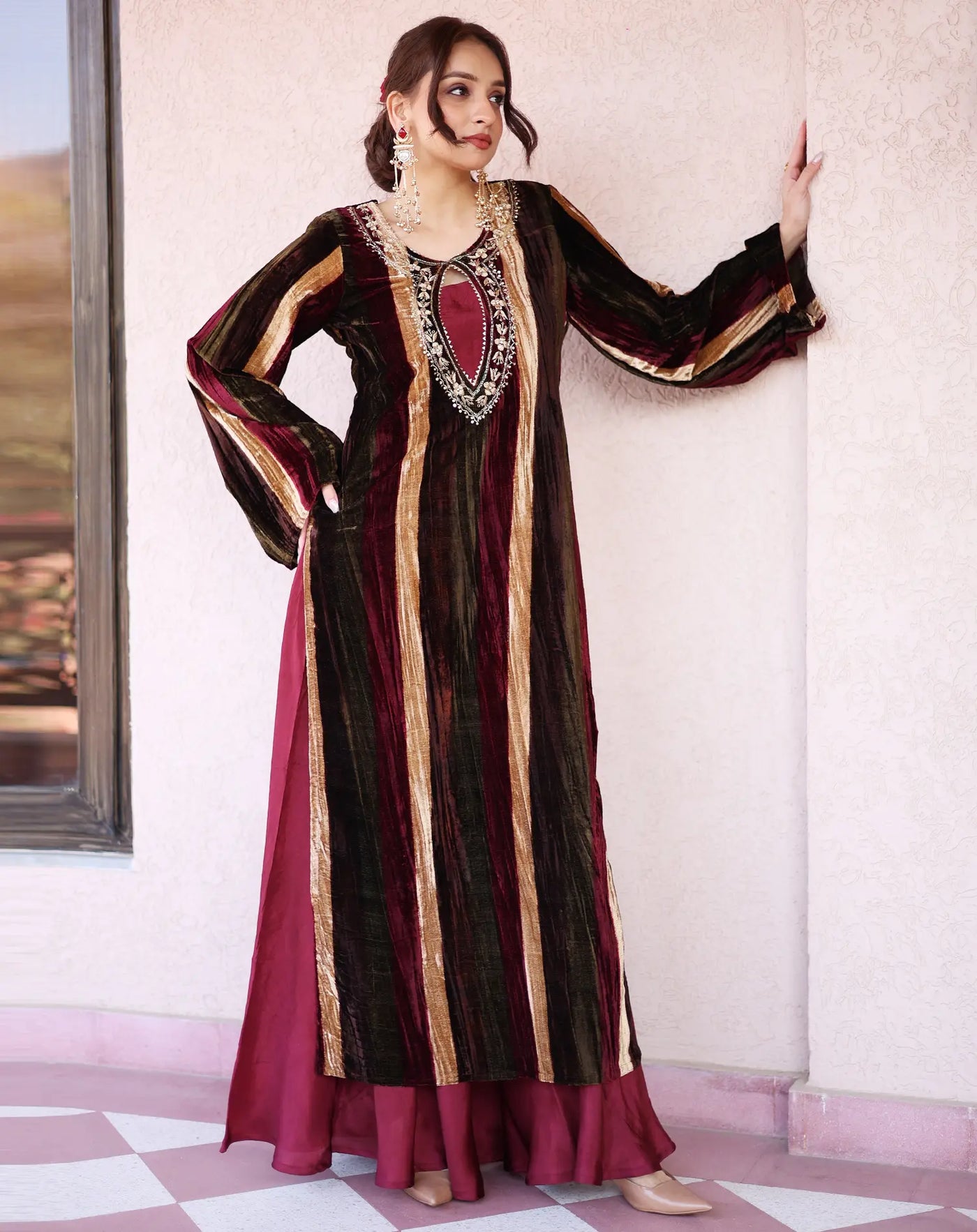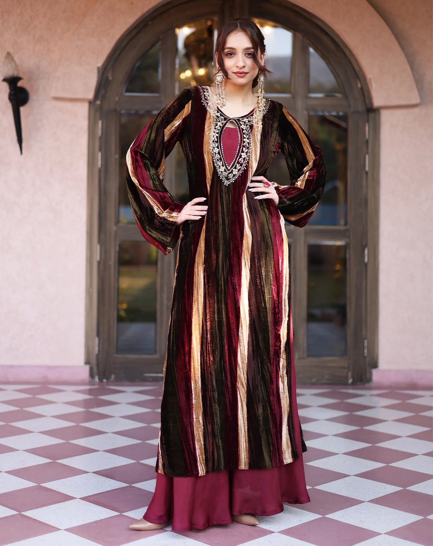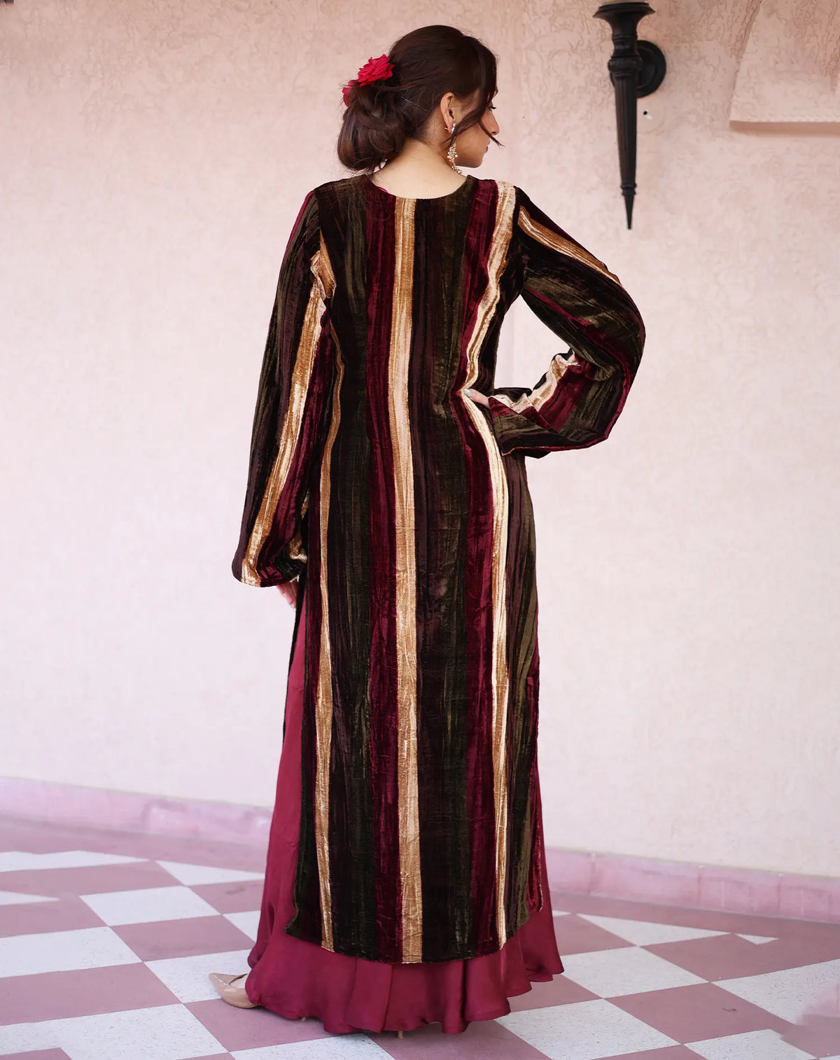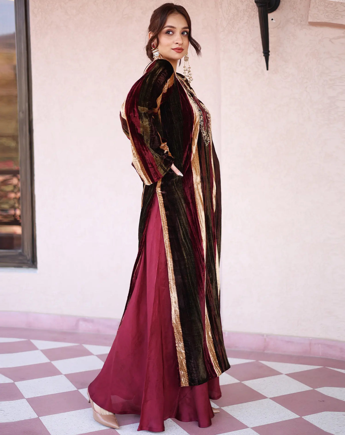 Ehsaas is emotion in form. The embossed velvet surface carries depth you can both see and feel, while the vertical panel detailing elongates the silhouette beautifully. Rich maroon undertones meet darker textures, creating a piece that feels ceremonial yet deeply personal.