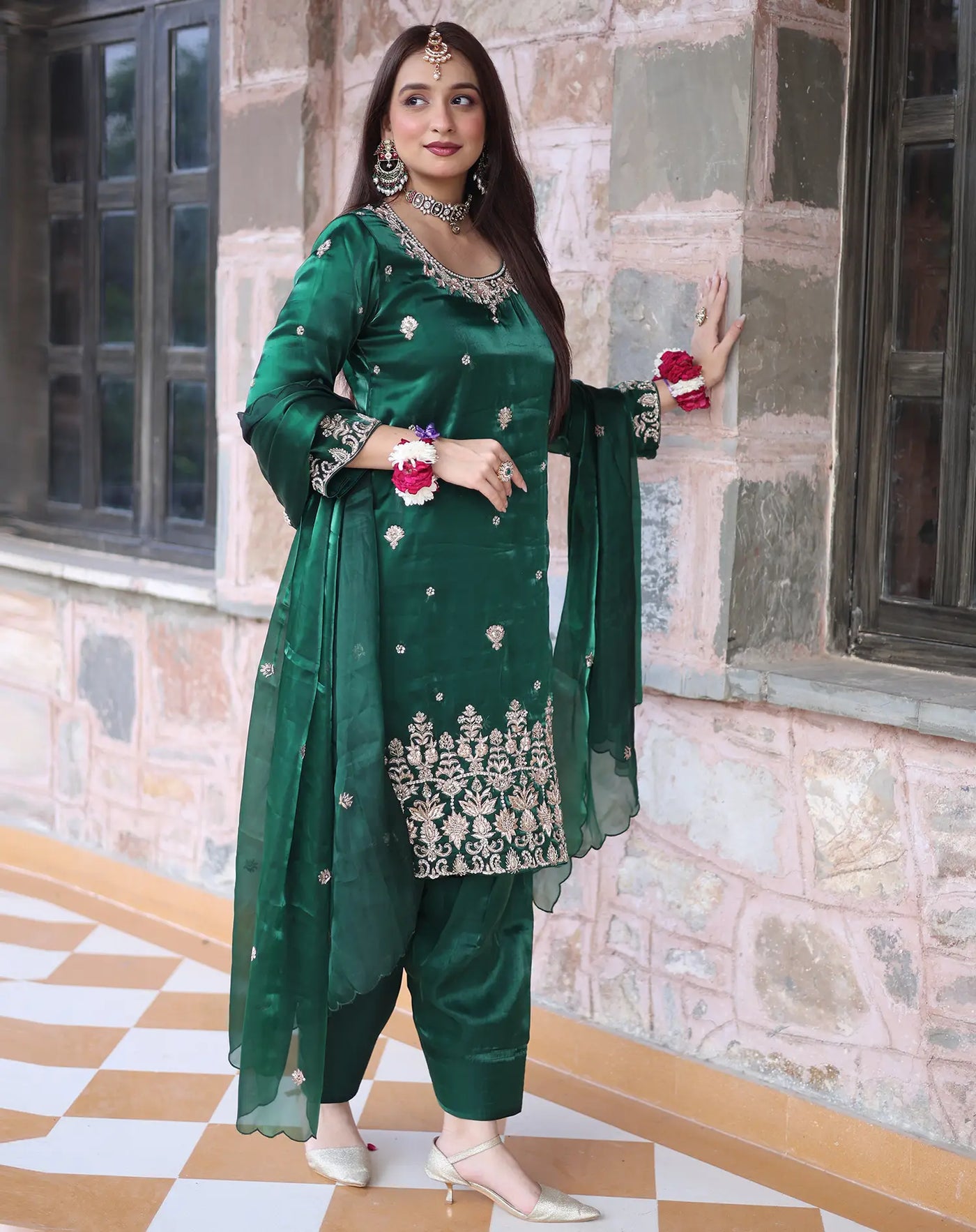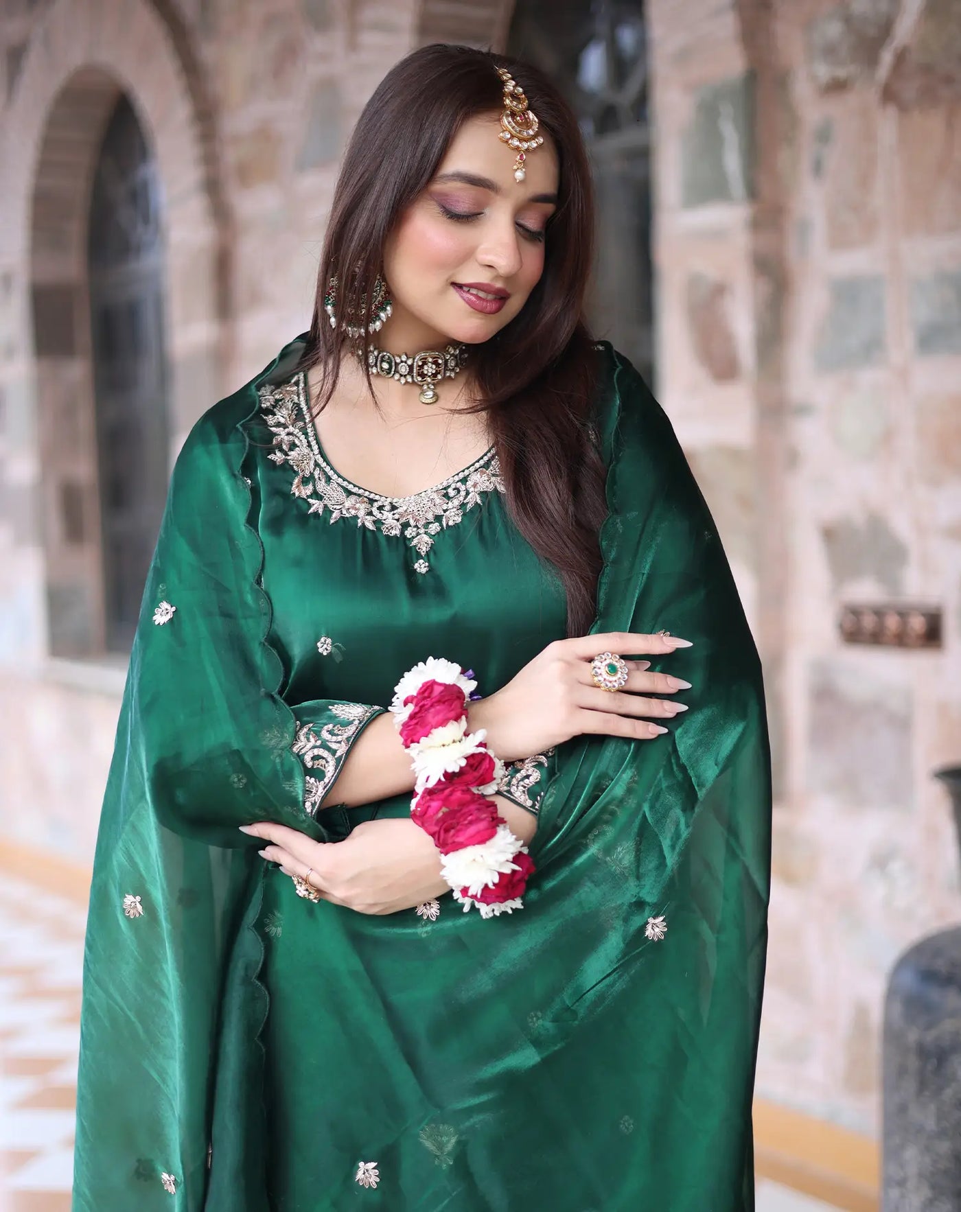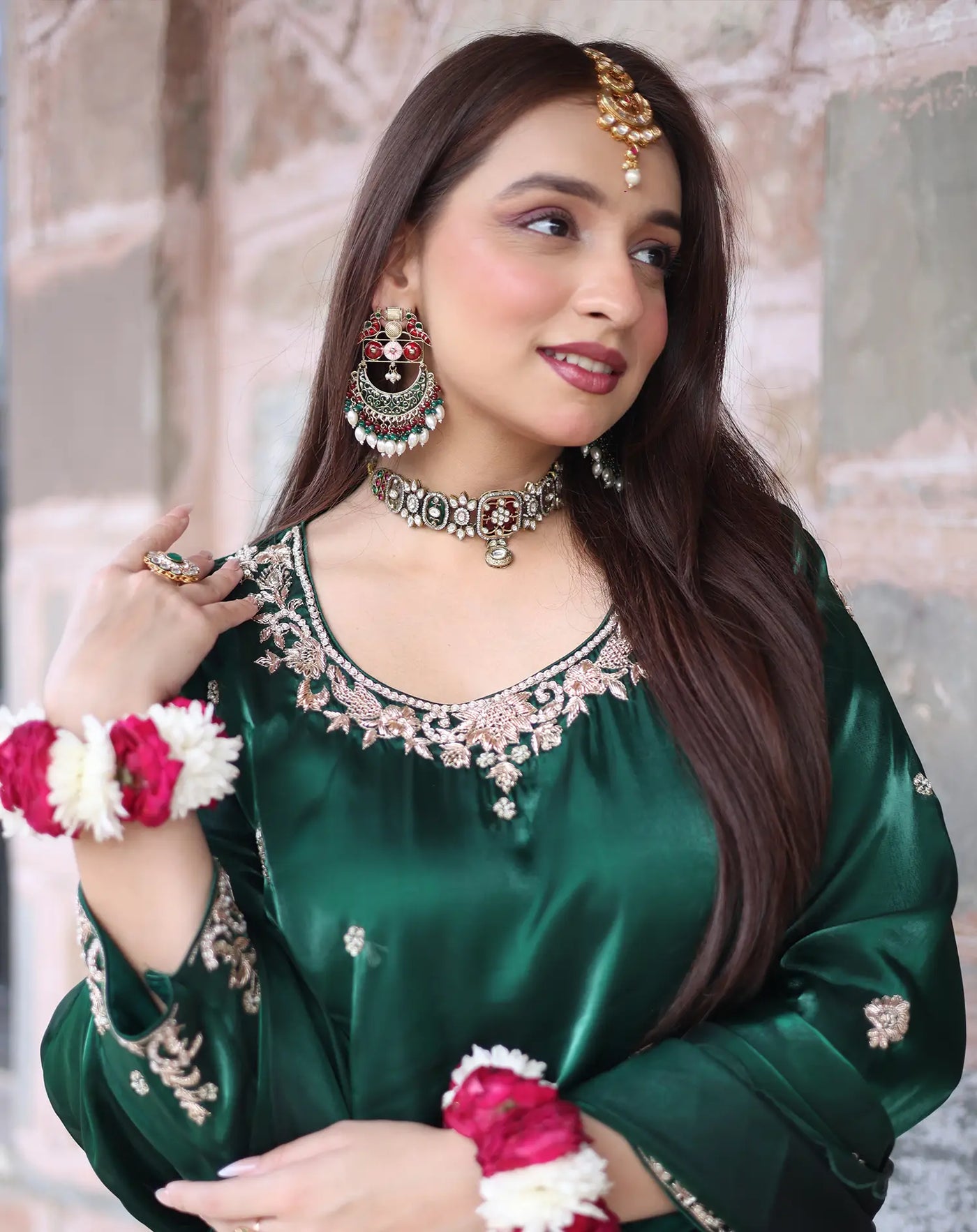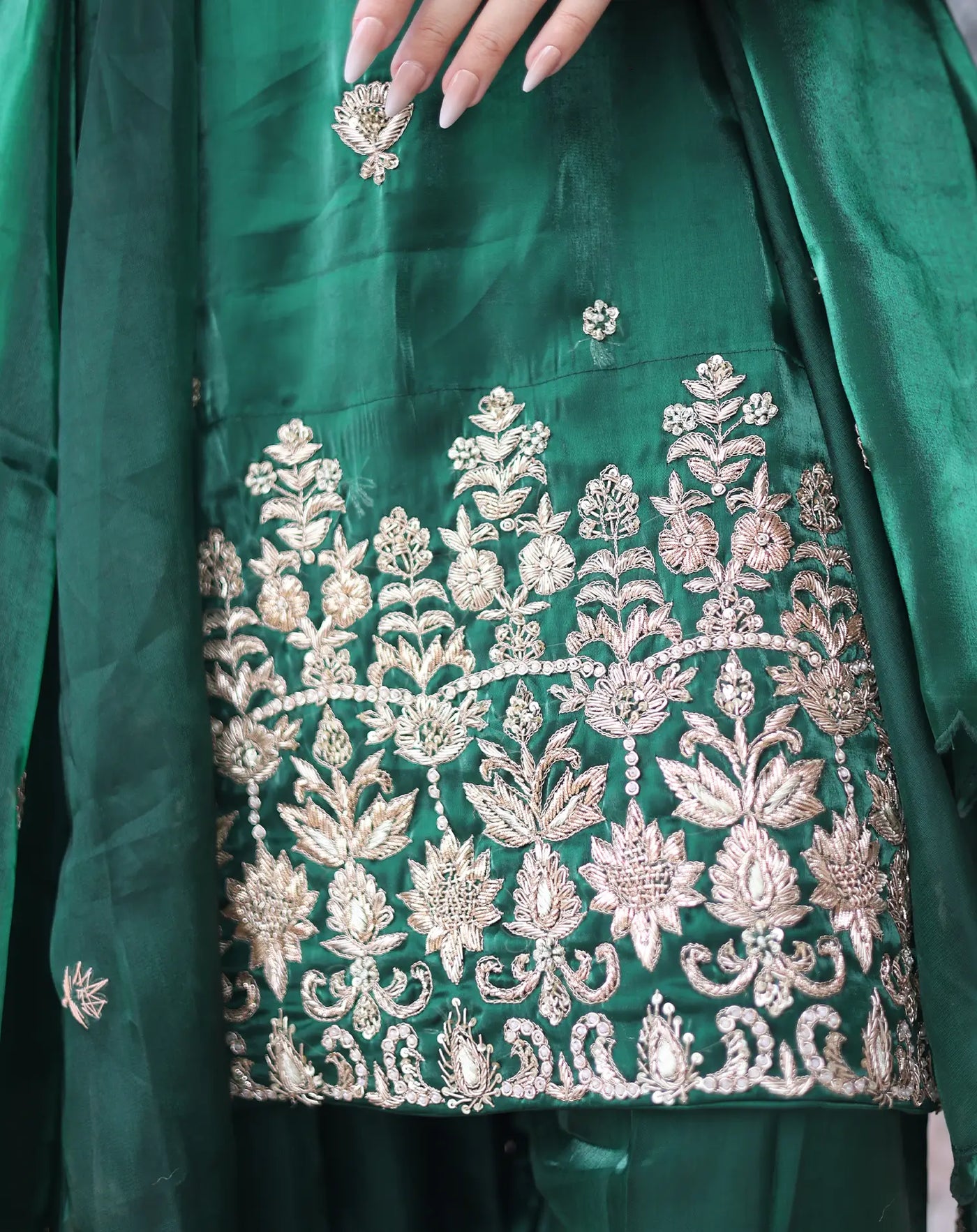 A graceful green kurta with classic floral motifs and refined hem embroidery. Balanced & elegant, this set captures festive spirit without being ostentatious - ideal for daytime celebrations and cultural gatherings.