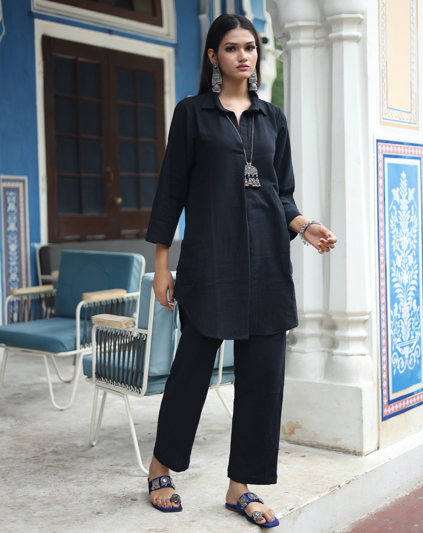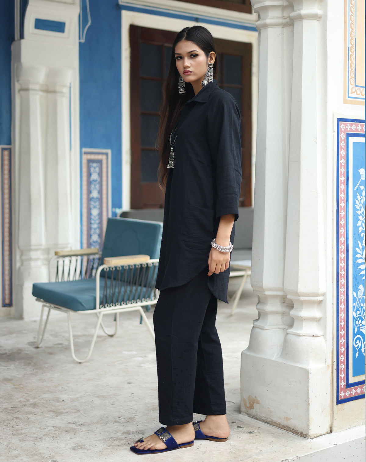 Ruhani is the quiet black classic - minimal, wearable, and dignified. A versatile ensemble for those who prefer refined understatement. It's a piece that speaks softly yet powerfully, emb- odying sophistication that never seeks attention yet always holds it.