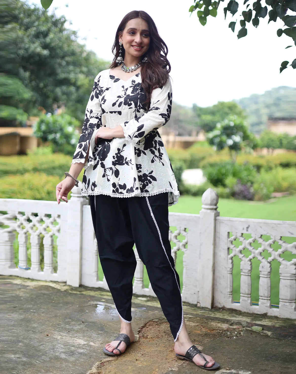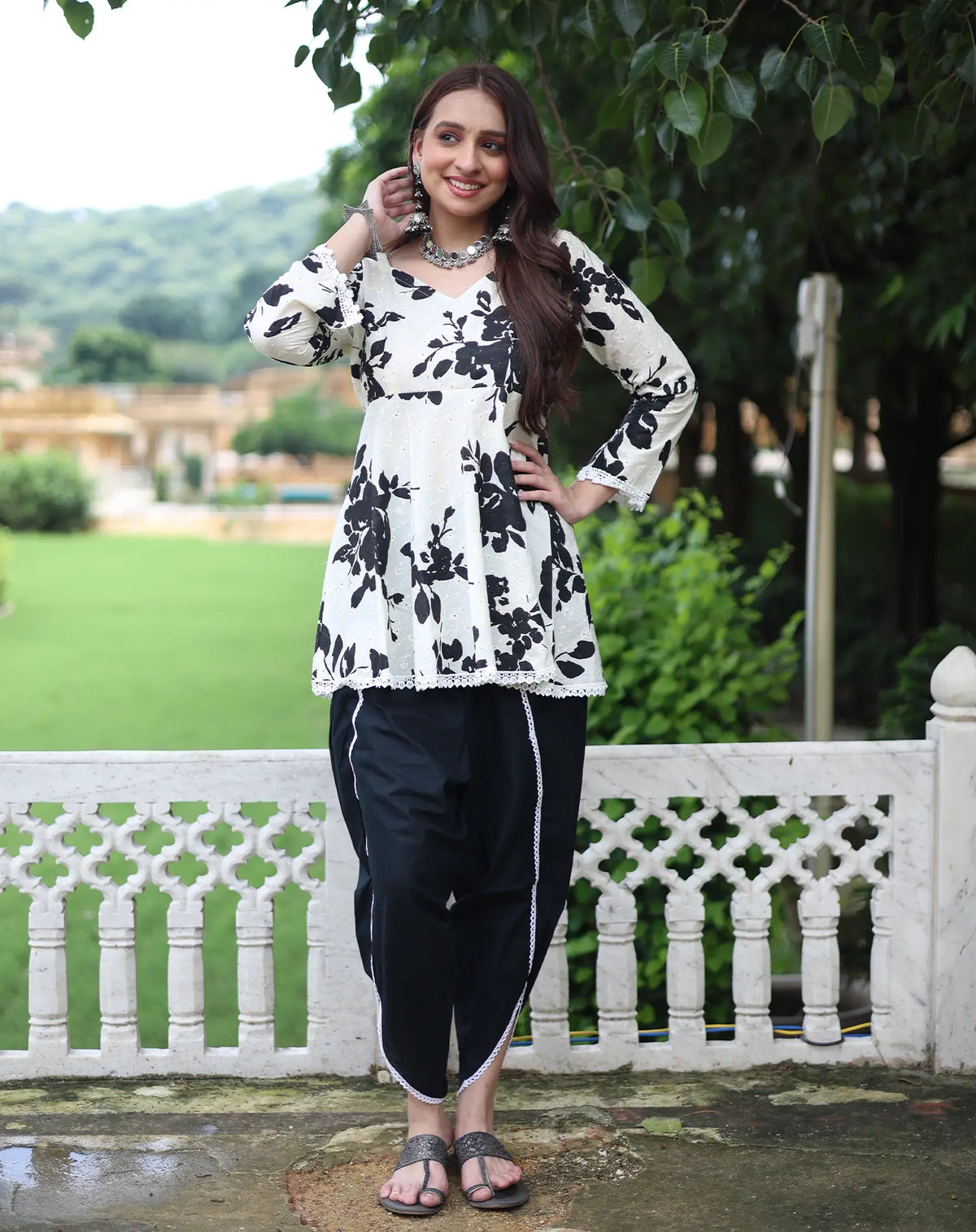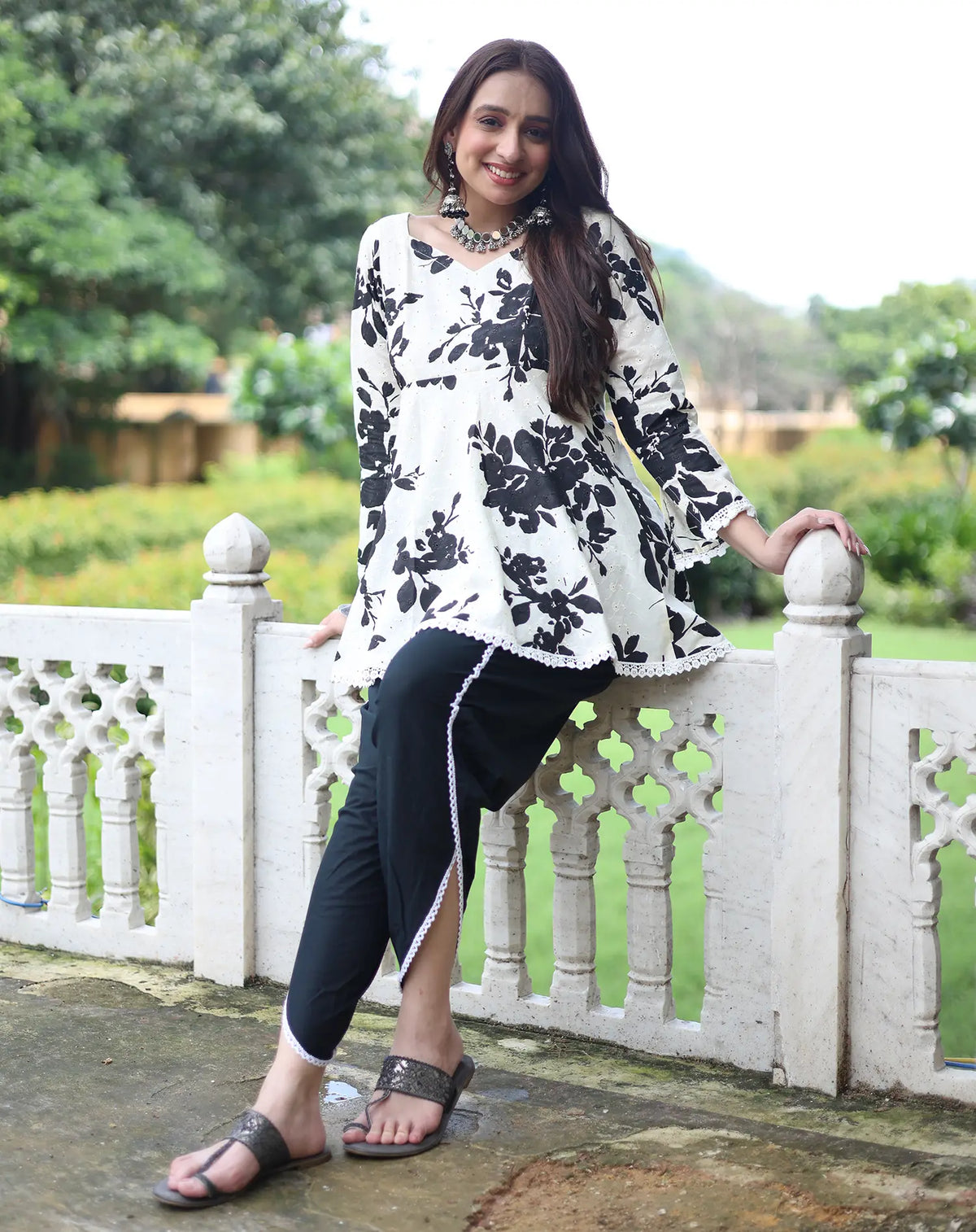 A contemporary take on monochrome florals. Tamira is a flared white tunic with bold
